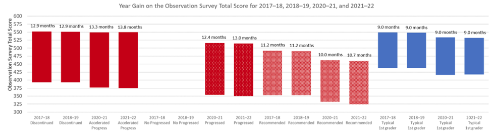 In our last post, we explored student growth with Observation Survey (OS) Total Scores for students with an outcome status of Accelerated Progress and Progressed. In this post, we’ll dig deeper into student growth by examining the change in OS Total Scores over time and their growth on two of the OS tasks in 2021–22.