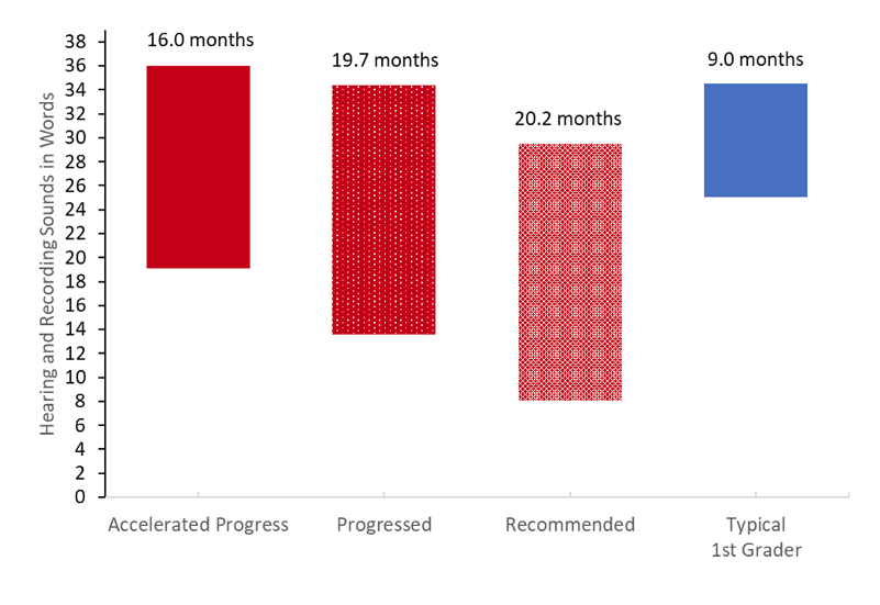 In Figure 3, we examine the average growth on the Hearing and Recording Sounds and Words task for children with an outcome status of Accelerated Progress, Progressed, and Recommended, compared to the typical first grader. Overall, children with an outcome status of Recommended had the most growth, averaging 20.2 months, followed closely by children with an outcome status of Progressed, averaging 19.7 months growth. Children with an outcome status of Accelerated Progress averaged 16.0 months growth, ending the year with an average score of 36.0 (out of 37). Meanwhile, children with an outcome status of Progressed ended the year with an average score of 34.4, almost reaching the average of the typical first grader, and children with an outcome status of Recommended made almost two years’ growth, ending the year with an average score of 29.5. The typical first grader started the year with a score of 25.0 and ended with a score of 34.5. This indicates that all three groups of Reading Recovery students made great progress, especially compared to the typical first grader.
