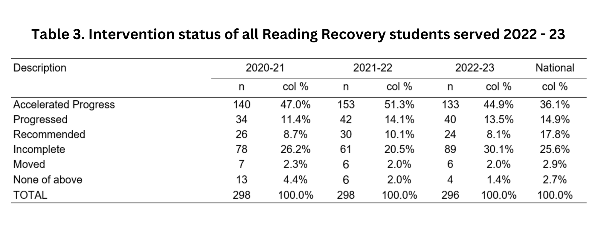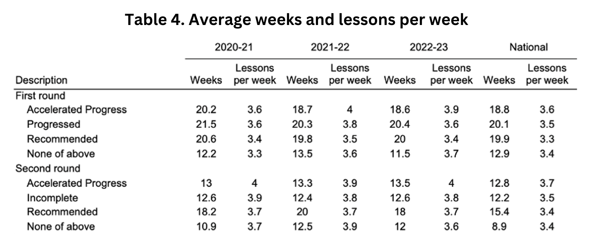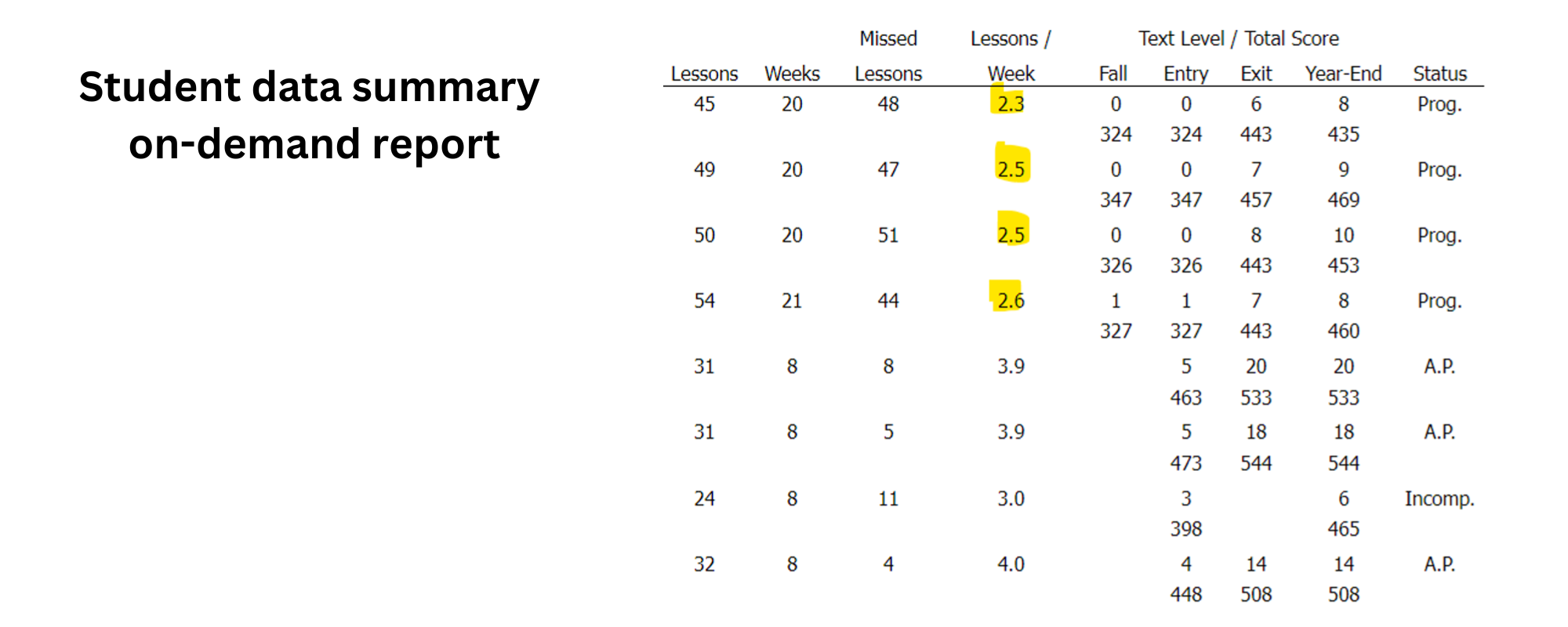 In the table above, in 2022-23, students in each status category averaged between 3 and 4 lessons per week. However, this table can hide lower rates for individual students or teachers as it averages the lessons per week across the entire site. It may be helpful to examine the Student Data Summary on-demand report. This report lists the students’ names, the number of lessons they received, their number of weeks, the number of missed lessons, average lessons per week, their text reading levels/total scores, and final status.