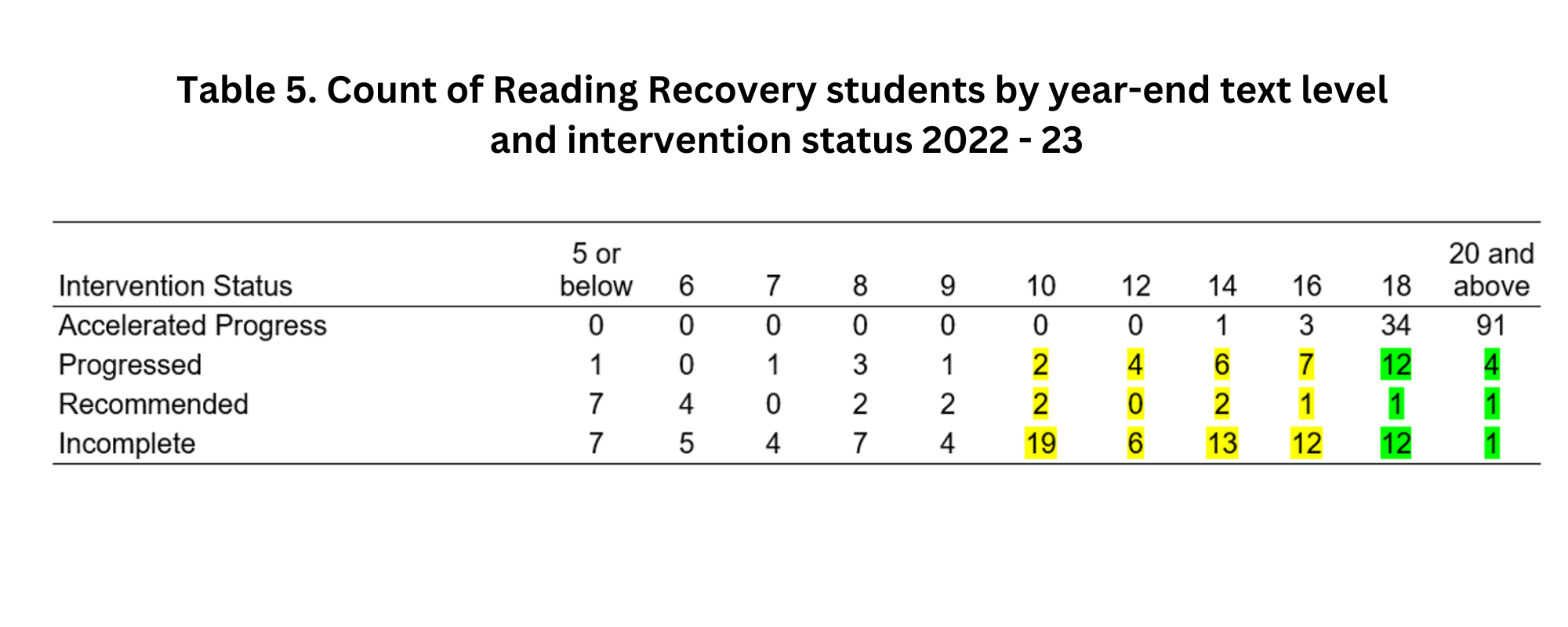 In my discussion with Mary Ann, Table 5 of the site report was highlighted as a critical table as it reveals students who were on the cusp of Accelerated Progress. Students who ended the school year at text reading levels of 10, 12, or 14 are such students. These students may have been able to achieve Accelerated Progress given additional time in instruction or if adjustments to their instruction had been made. Table 5 is also helpful in identifying students who ended the school year at high text reading levels but were not given the status of Accelerated Progress.