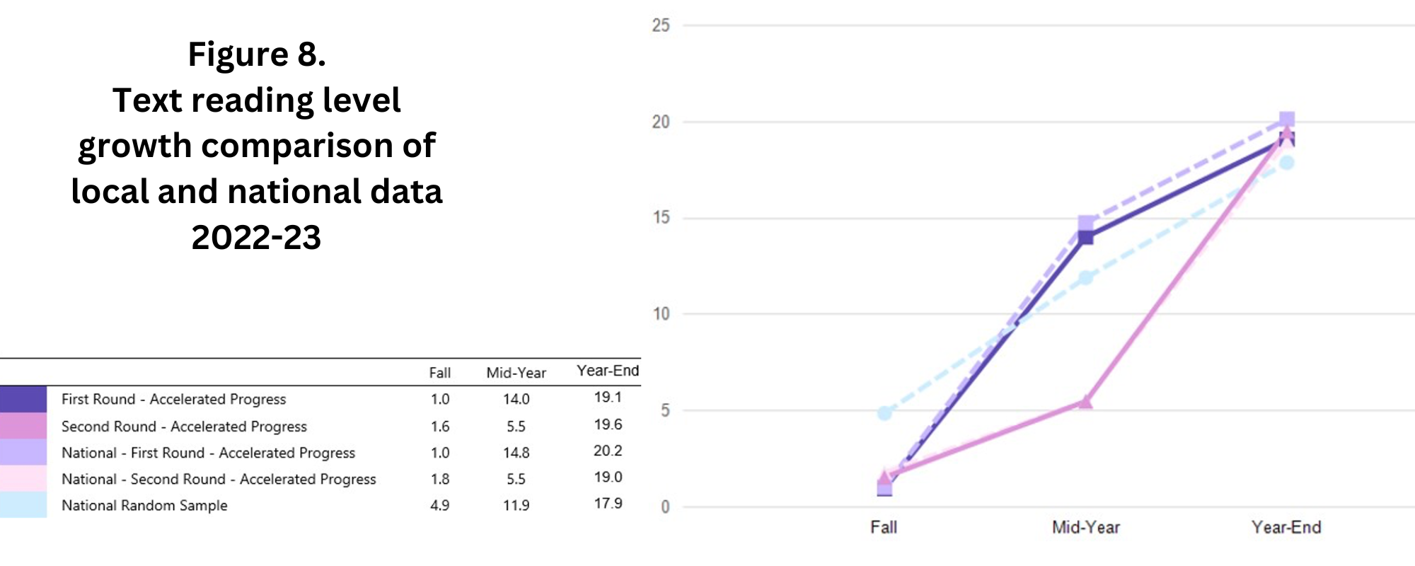 Additionally, Figure 8 provides a useful visual representation of how a site compares to national data. Figure 8 in the site report illustrates the progress in average text reading levels of first and second round Accelerated Progress students compared to first and second round Accelerated Progress students nationally. Above, the site’s first round Accelerated Progress students were just below the national Accelerated Progress students (19.1% vs. 20.2%), but the site was slightly ahead of the national average for second round Accelerated Progress students (19.6% vs. 19.0%). Additionally, both first and second round Accelerated Progress students from the site and the nation had much lower averages in the fall than the national random sample but exceeded the random sample text reading level at the end of the year.