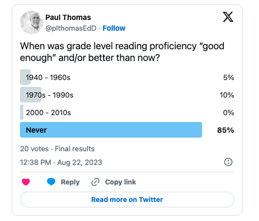 As I document in my reading policy brief and my book on reading wars, there has not been a single moment in the history of the US since at least the 1940s that we have not in the media and by politicians lamented low reading proficiency in students; as well, no standardized measurement of reading proficiency has ever been substantially different than now.