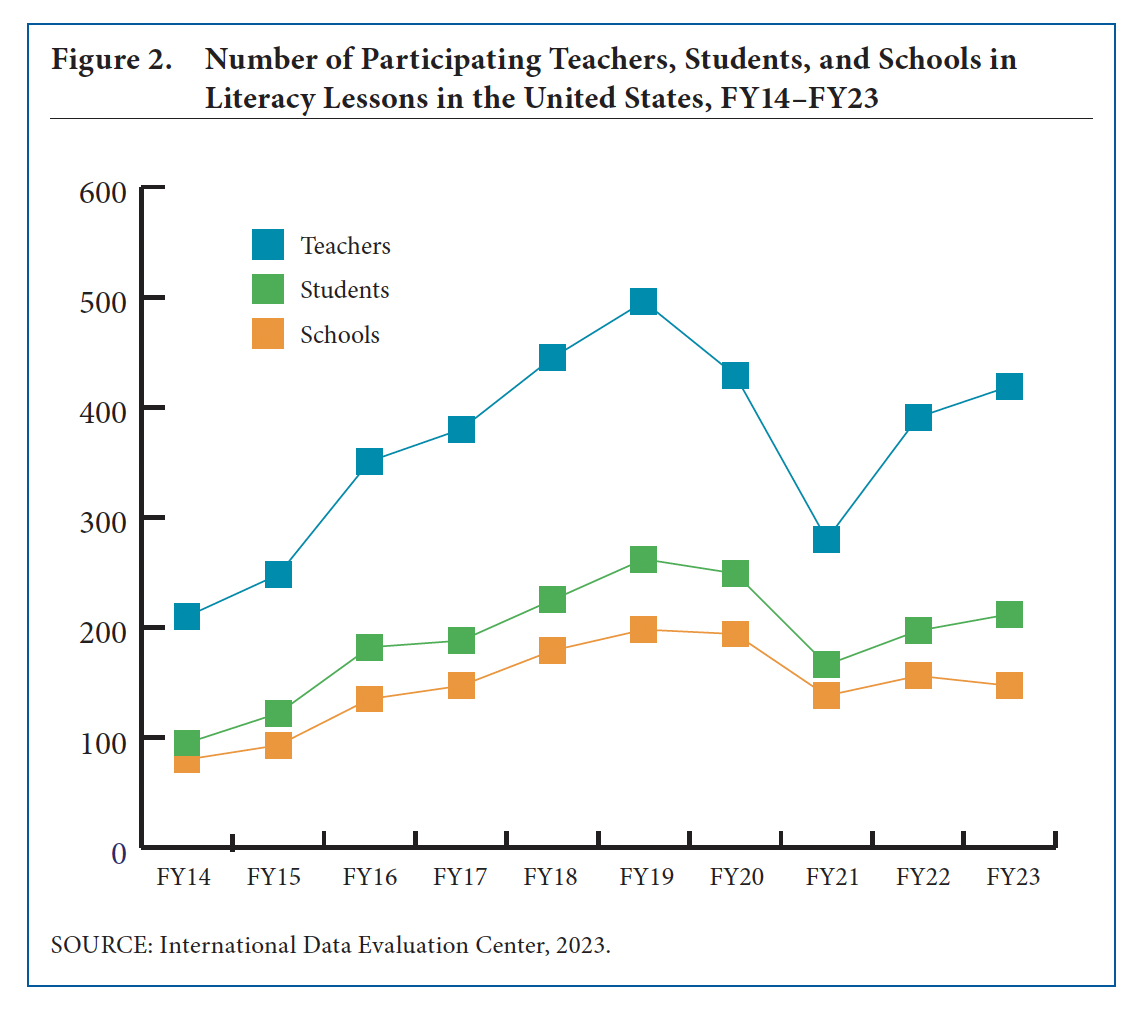 As Reading Recovery teacher training sites and university training centers began and sustained implementations of Literacy Lessons over the past 10 years, we have learned more about effective operations and essential practices. With the exception of the pandemic years, the national number of schools, teachers, and students participating in Literacy Lessons has increased over time as shown in Figure 2.