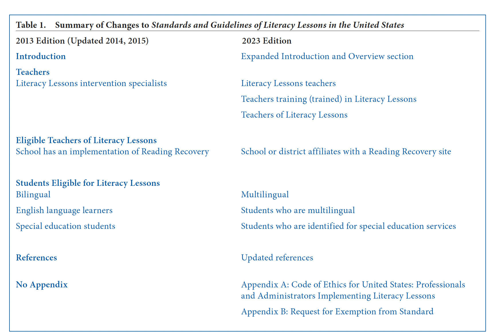 The intent in this section is to draw attention to particular differences, including additions, revisions, and clarifications that may support the implementation and growth of Literacy Lessons sites within the United States. Not every difference between the 2013 and 2023 document is detailed within this article.