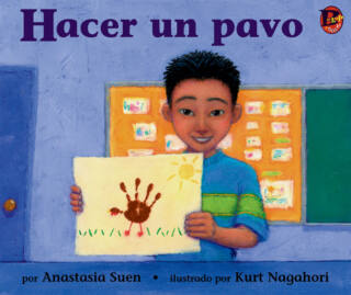 A Japanese American boy demonstrates a fun classroom project - making a picture of a turkey from a handprint.