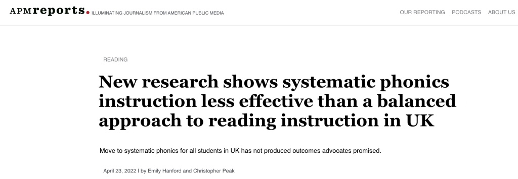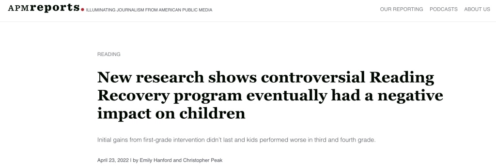 When people complain about bias, one aspect of bias often ignored is that all media determine what to cover and what not to cover (Hanford covers anything that seems to further the “science of reading” propaganda, and ignores anything that challenges it). In the case above, the research on Reading Recovery is easy to twist into the “science of reading” agenda, but the research from the UK is a whole different matter.