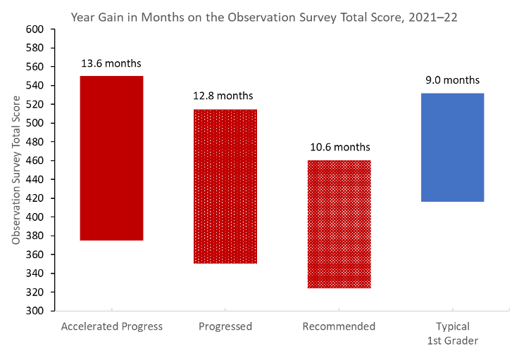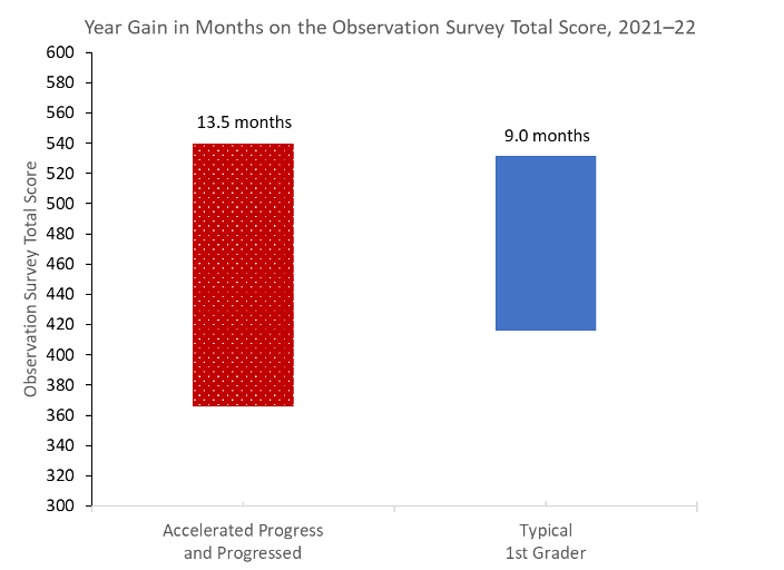 We also see that children with an outcome status of Progressed averaged 12.8 months of growth in a typical nine-month school year. These students started the school year with a lower average OS Total Score than children with Accelerated Progress (350 compared to 375), and the typical first grader (350 compared to 416). While they did not quite reach the class average by year-end, they closed the gap (515 on average compared to 532). Children in this category made substantial gains, averaging nearly 13 months growth in just nine months.