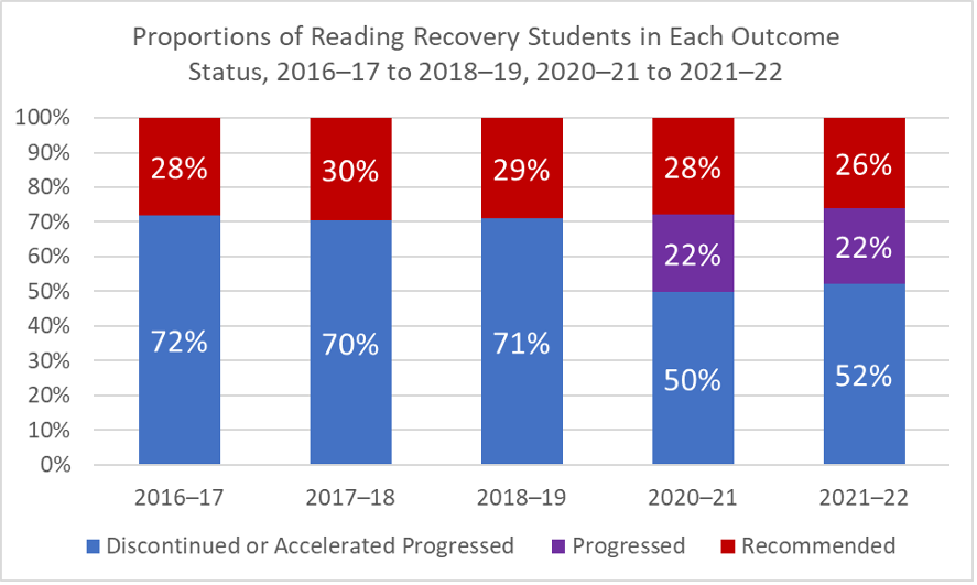 Figure 2 shows the percentages for the different outcomes across five years. We see that from 2016 to 2019, approximately 70% of Reading Recovery children had an outcome of Discontinued (or what is now called Accelerated Progress) and approximately 30% of children had an outcome of Recommended. In 2020-21 and 2021-22, the category Discontinued was renamed Accelerated Progress, and the category of Progressed was introduced. We see the percentage of Accelerated Progress decreased to approximately 50%, Recommended was just below 30% and then dropped to 26%, and the Progressed category was stable at 22%. When looking across the years, we can see that the combination of Progressed and Accelerated Progress nearly equaled the previous years’ percentage of Discontinued at roughly 70%. The combined total of children with an outcome of Accelerated Progress or Progressed was 72% and 74% in 2020-21 and 2021-22, while in previous years children with an outcome status of Discontinued accounted for approximately 70% of Reading Recovery children. Consequently, we wonder whether most children in the Progressed category were previously included in the Discontinued category. The Progressed category may also be drawing some of the children away from the Recommended category as well. We are curious to see what happens with the category of Progressed as we continue to serve Reading Recovery children in the coming years.