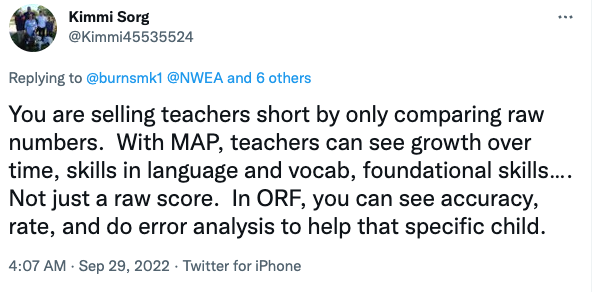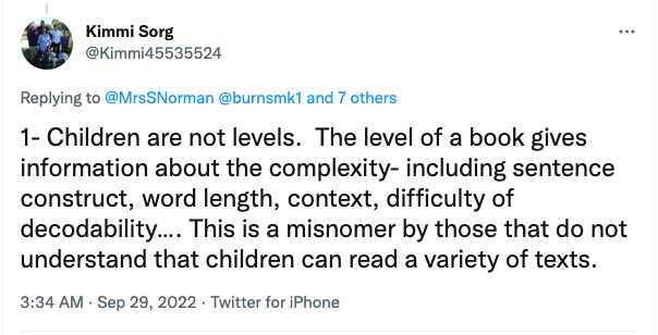 I was getting sucked down further as 3:00 am approached. I reminded the original author that they are selling teachers short by assuming they do not use data in a more organic, diagnostic way, other than level. By 3:30 am, I responded again by giving my answer to the original question posed about grouping kids. “No — analysis of the data is needed to make instructional decisions.”